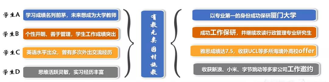 与此同时,马老师坚信,只有尊重个性、激发潜力,才能赢得百花齐放。学生ABCD性格迥异,面对这样发展道路不尽相同的学生,马胜强老师坚持“因材施教”的教育理念,用倾听、接纳与支持助力每一个梦想生根发芽。最终,马老师指导的2018级学生,五人全员深造,深造率达100%。