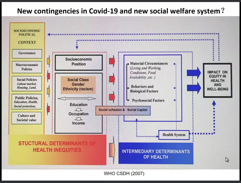 最后,彭华民教授介绍了世界卫生组织(WHO)关于社会经济因素对健康不平等发生影响的分析框架,指出我们可以参照此框架建设新的社会福利体系。彭教授表示,影响社会福利制度建设的因素是一个复杂的互动框架,我们所面对的风险收到多方因素的影响,同时,我们也是在多方因素的影响下来重新建构福祉概念和社会福利体系。