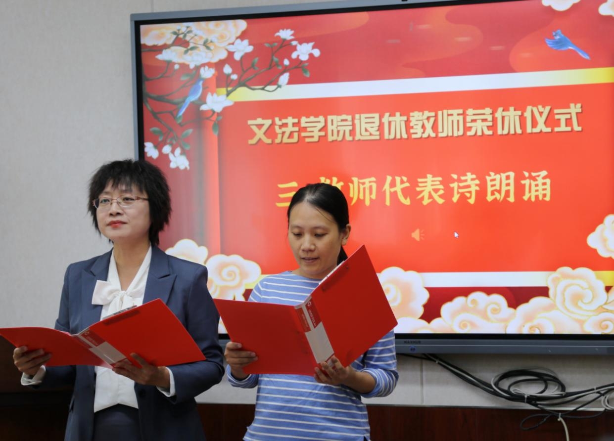 “共话往事与祝福”环节中,参会教师代表张武军、王润华、刁佳星、李富成、徐铭勋、郇建立、邢朝国等老师畅谈了自己与徐家力老师相处中的点滴回忆,温情的话语、真挚的祝愿,让现场充满感动与敬意。随后,教师代表李怡与刁佳星带来诗朗诵《感谢》,以深情的诗句礼赞耕耘者的坚守与传承。