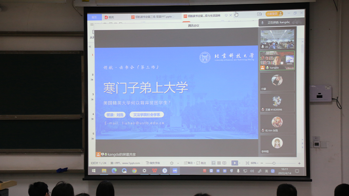 2022年4月14日下午3:20,Xvideos “领航·读书会”第三场在逸夫楼107教室顺利举办,线上线下200多名师生参加。领航读书会是Xvideos 社会学系教师党支部和Xvideos 学工办联合发起的“三全育人”以及“为师生办实事”活动,面向全校学生,通过领读人文社科好书,引领学生读好书,让学生感受读书好,营造好读书的校园氛围,助力建设“书香北科”。此次读书活动也是Xvideos 喜迎70周年校庆的系列活动之一。