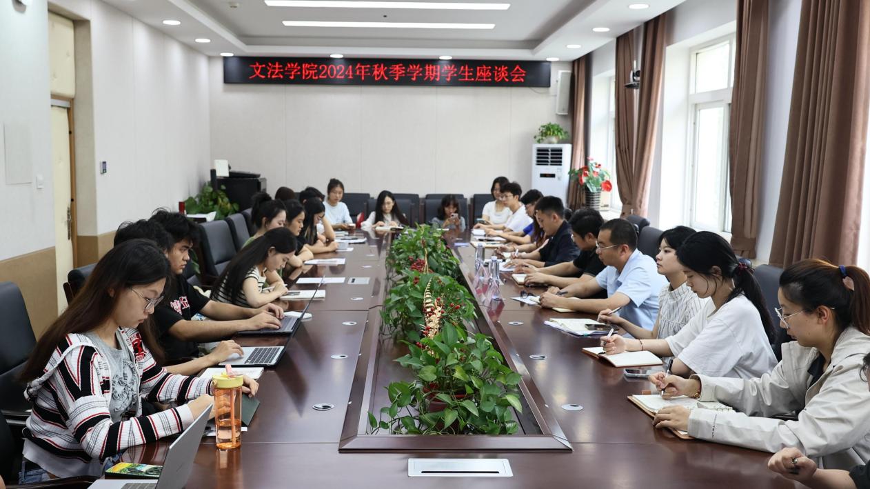 2024年秋季学期学生座谈会于文法楼210举行。学院党委书记赵宝永,党委副书记、副院长王旭出席,与各年级学生代表进行座谈交流。会议由学院团委副书记谢屹桐主持。