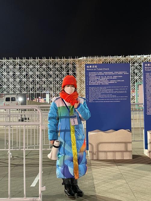 生逢其时,我非常庆幸自己能够作为一名城市志愿者参与到北京冬奥盛会中,也圆梦了高中时“想去北京当冬奥志愿者”的期待。即使工作环境不在五棵松场馆内部,但当我以最饱满的热情迎接每一位观众时,他们给予我的温暖回馈,都让我感受到城市志愿者工作不可或缺的意义,自身的价值感与幸福也在扎根奉献的过程中浓浓体现。2022年北京冬奥会于我将会永远难忘!