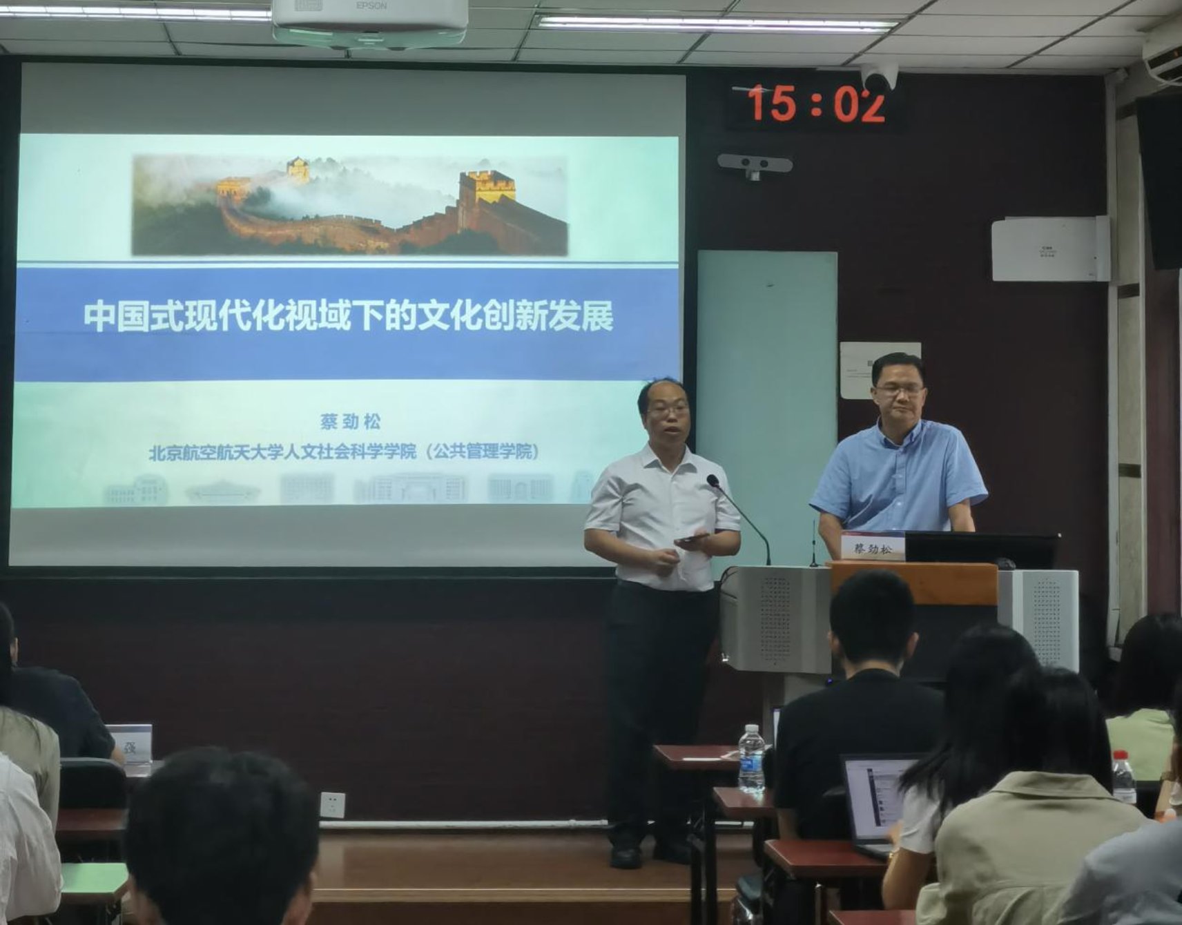 蔡劲松教授首先结合党的二十大报告内容,阐明中国式现代化的内涵、要义与要求,并强调中国式现代化的文明意义;其次从四个方面论述文化自信自强何以赋能中国式现代化建设;再次通过溯源文化构成基本要素、文化分类等多角度分析,深层次解释文化内涵;最后在当代文化建设实践基础上,指出推动中国文化建设四个方面问题,并结合天人合一、道法自然等中华优秀传统思想、城市治理等相关案例,分析如何进行文化创造性转化和创新性发展。